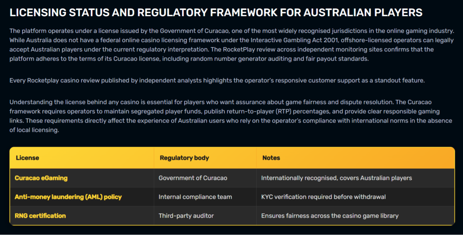 A platform can have a broad game library and still feel clumsy if navigation does not support it. RocketPlay’s page argues for a more selective approach, where browsing by category and popularity works better than opening everything at once, especially since Australian player activity trends are concentrated around pokies style slots, live dealer alternatives, and card games such as blackjack and baccarat. In practical terms, smart filtering improves usability almost as much as raw site speed. ✅